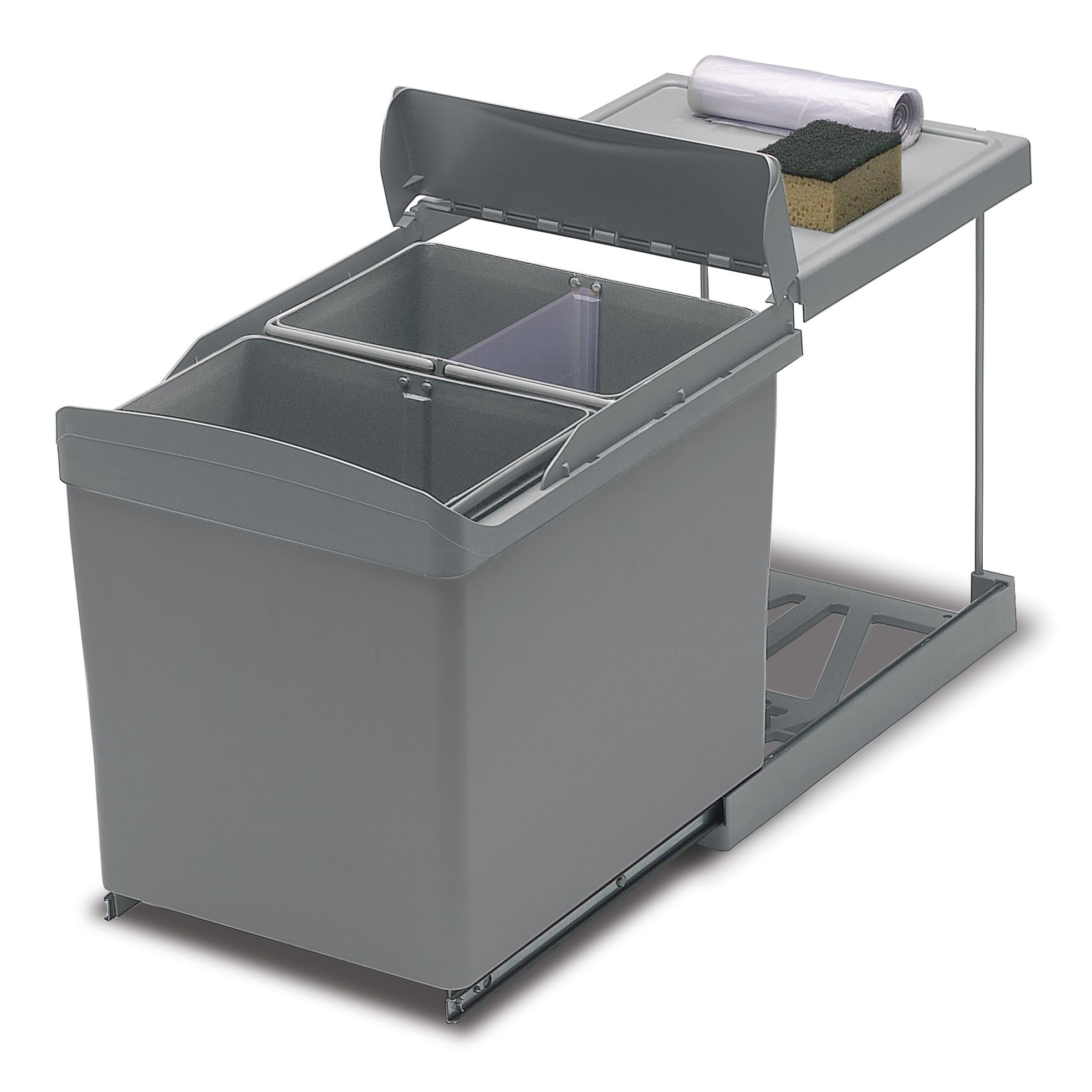 Výsuvný zabudovaný odpadkový koš na tříděný odpad s automatickým vysunutím s dvířky - montáž na dno skříňky.