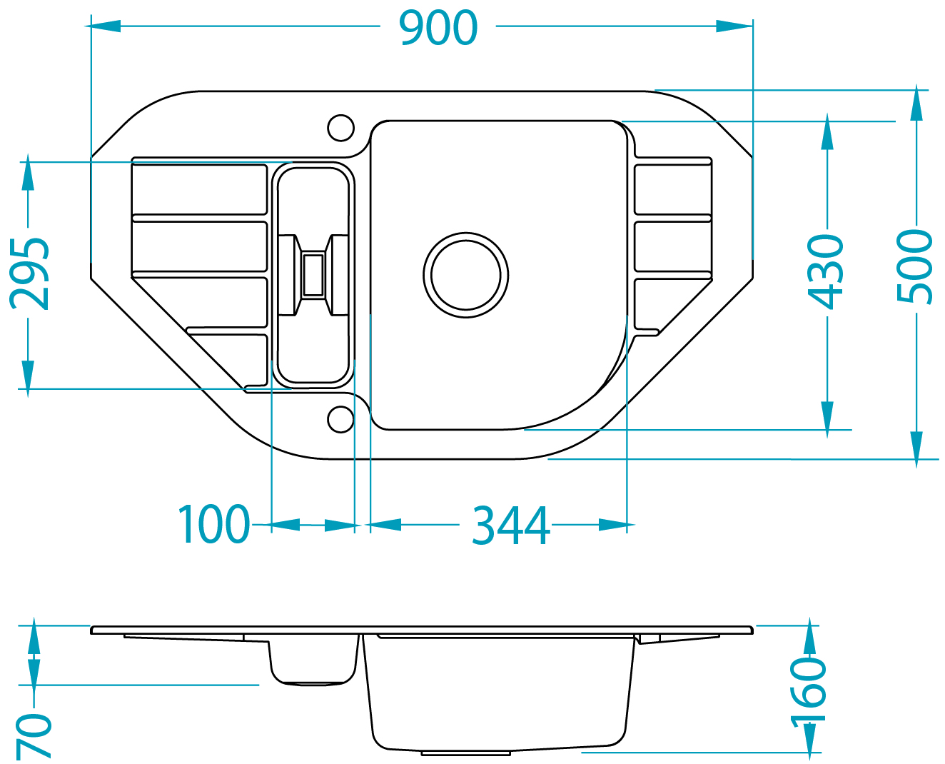 - rozměry vany: 344 x 430 x hloubka vany 160 mm a 100 x 295 x hloubka vany 70 mm