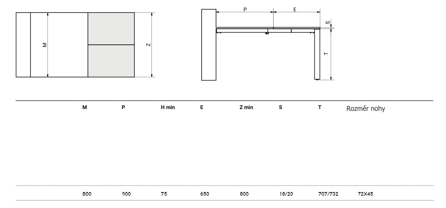 - vhodné pro stolovou desku o šířce 800 mm a hloubce ve složeném stavu 900 mm