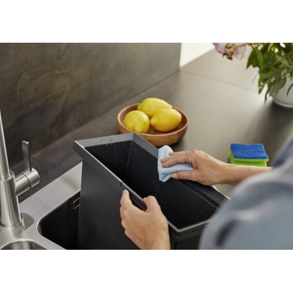 Jeho moderní design s integrovanou konstrukcí, která eliminuje zbytečné záhyby, efektivně brání znečištění. Snadno vyjímatelné víko zajišťuje jednoduché čištění všech částí, díky čemuž se daný koš udržuje v čistotě.