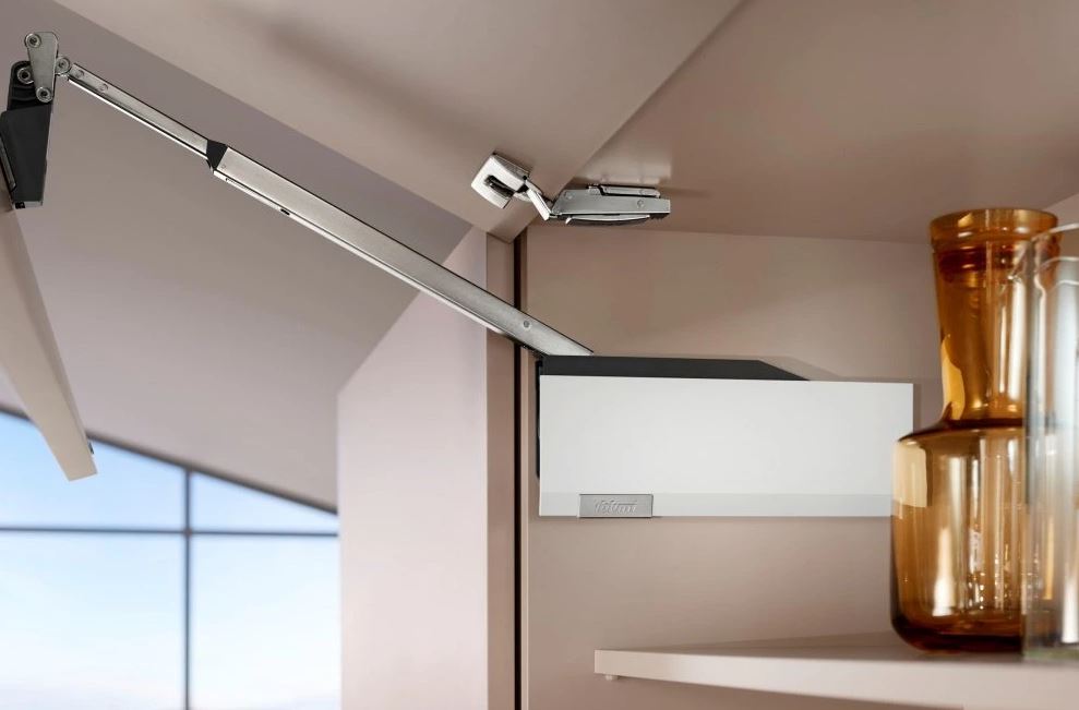 Aventos HF-TOP silný s eurošrouby je určený pro výklopná zdvojená dvířka u horních skříněk v kuchyni nebo koupelnách, kde je omezený prostor nad pracovní deskou.