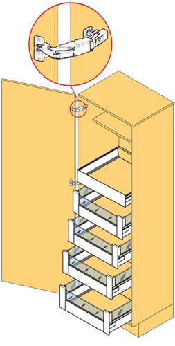 BLUM Space Tower Legrabox Pure v odstínu šedá orion obsahuje kování pro zásuvky do potravinové skříně včetně NK závěsů 155° s tlumením a čelních příchytů do šíře korpusu 450 mm.