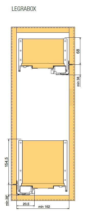 BLUM Space Twin Legrabox v odstínu bílá obsahuje kování pro úzkou skříňku, od šíře korpusu 200 mm.