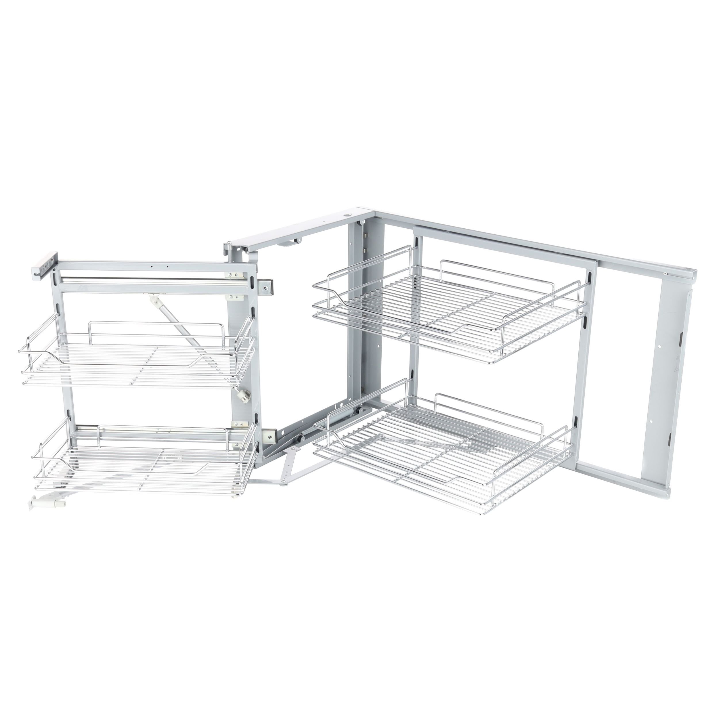 Drátěný rohový koš do spodní skříně kuchyně s dotlumením.