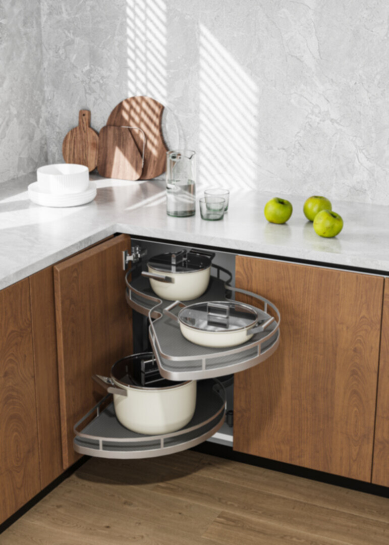 Maximální využití prostoru v rohové skříňce s plynulým dotlumení a moderním designem od firmy CEMUX.