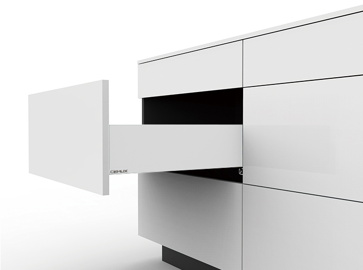 Zásuvka H Box SLIM s ultratenkou bočnicí a výsuvem TIP-ON pro bezúchytkové otvírání.