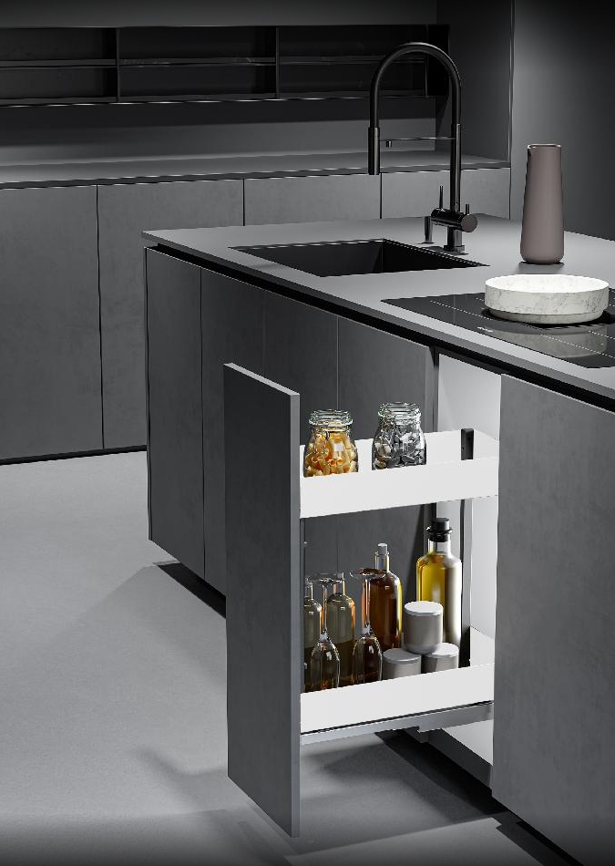 Výborná volba pro využití a organizaci prostoru v úzké spodní skříňce v kuchyni s plynulým dotlumením a moderním designem od firmy CEMUX.