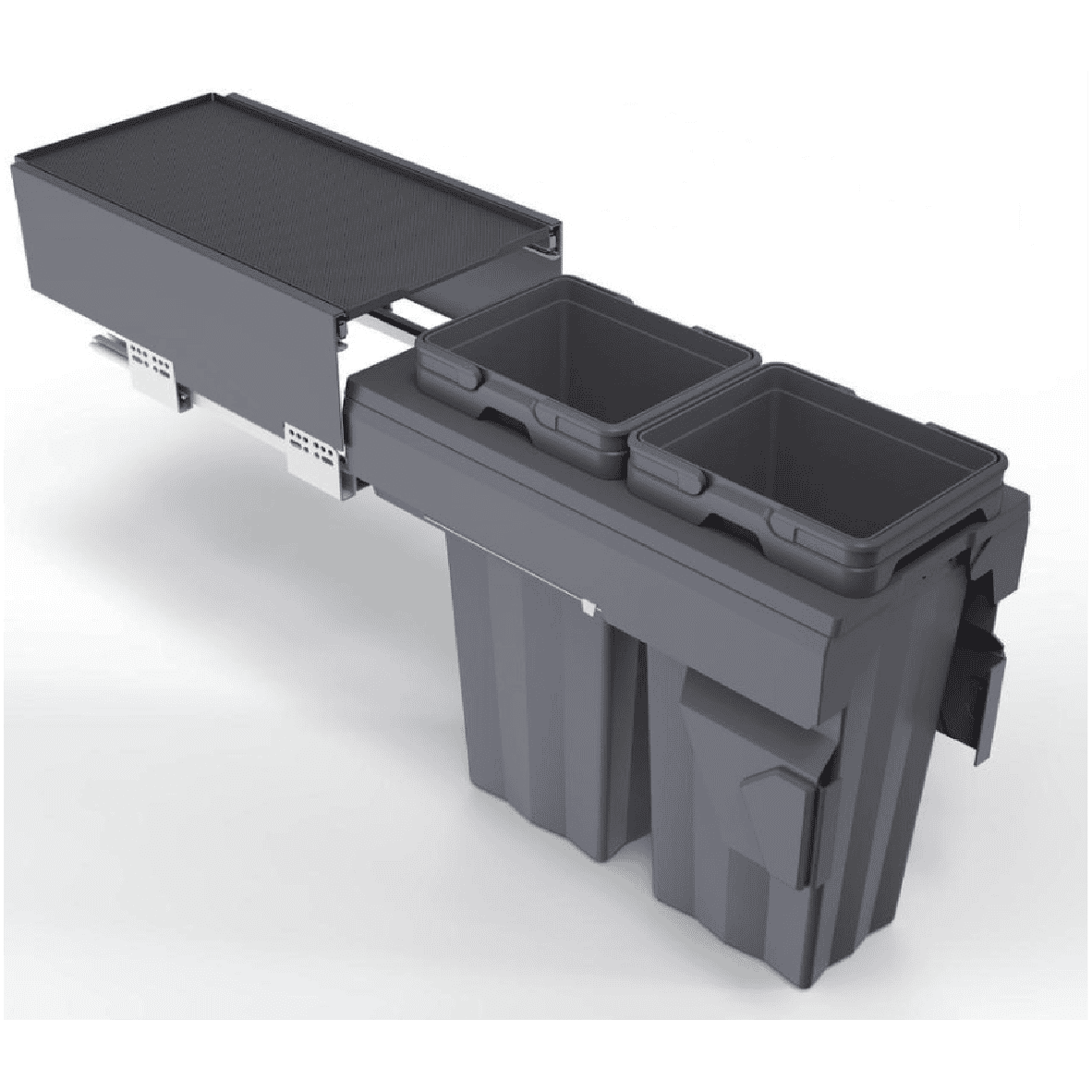 Velkokapacitní výsuvný odpadkový koš Cemux sorter HQ na tříděný odpad se skrytým plnovýsuvem s tlumením, včetně výsuvné police.