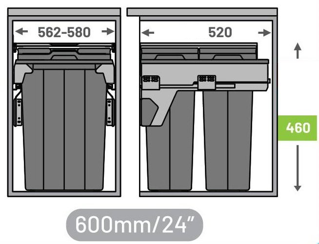 Výška koše je 460 mm s objemem 2 x 13 L a 1 x 28 L.