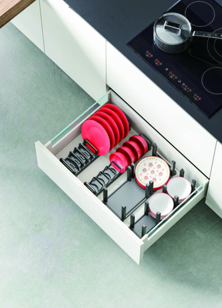 Praktický držák na misky s přizpůsobitelnými příčkami do zásuvek pro hloubku 500 mm. Držák je v šedém provedení a je vyroben z odolného plastu.