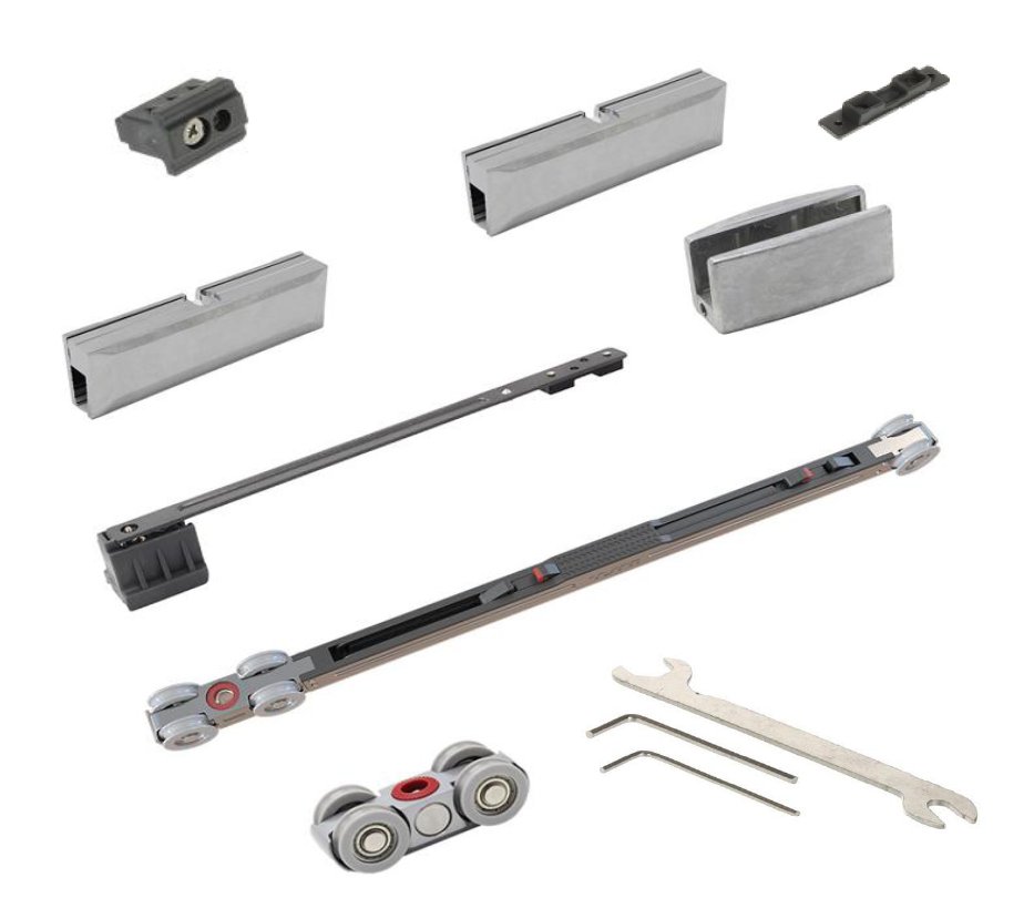 Sada pro 1 křídlo pro posuvné skleněné dveře firmy Cemux STARSHIP GLASS dodávané včetně kolejnice.