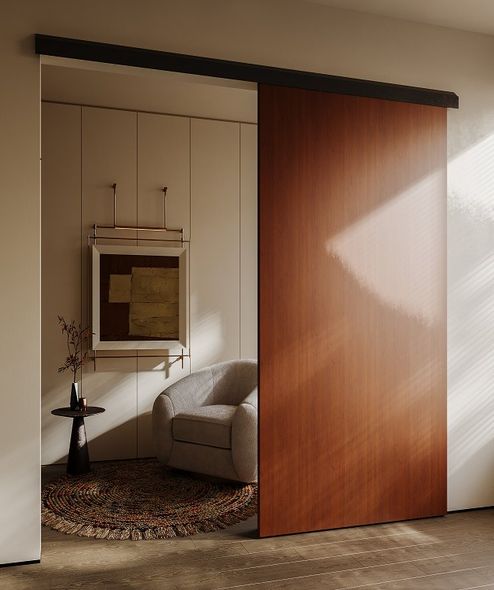 Sada kování pro 1 křídlo pro posuvné dřevěné dveře firmy Cemux STARSHIP STANDARD dodávané včetně černé kolejnice.