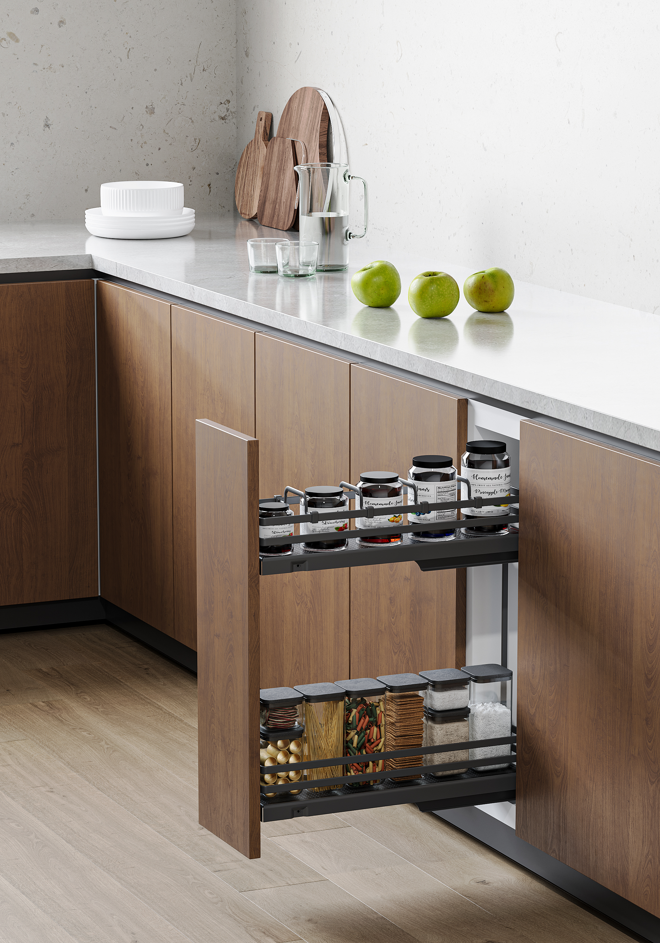 Plnovýsuvný dvojkoš boční s plným dnem určený do úzkých spodních skříněk v kuchyni.