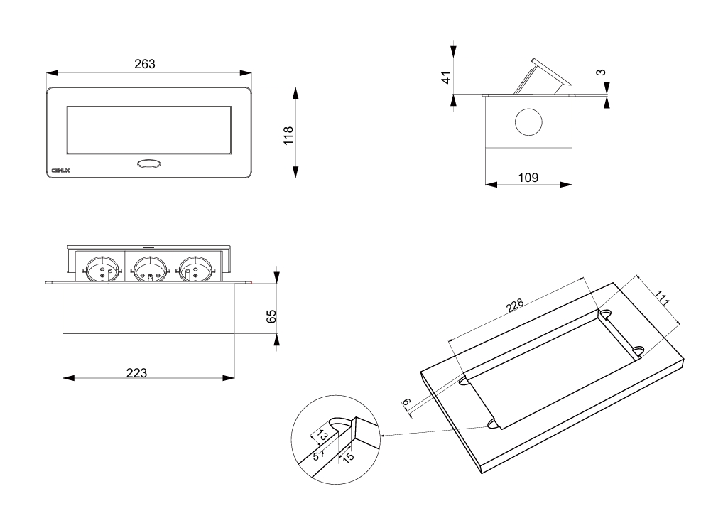 - Montážní otvor: délka 228 x šířka 111 x hloubka 65 mm