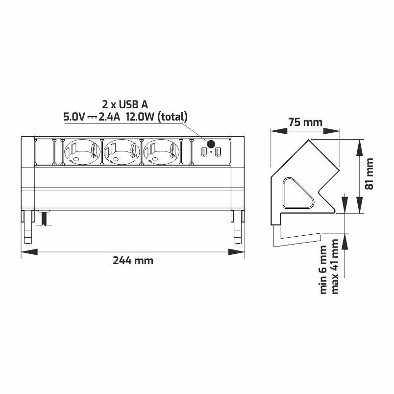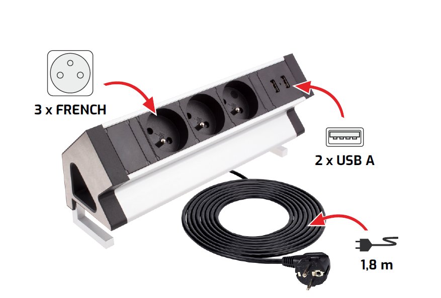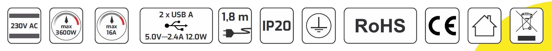 - zásuvka obsahuje: 3 x zásuvku 230V a 2x USB nabíjecím portem 5V / 2,4 A