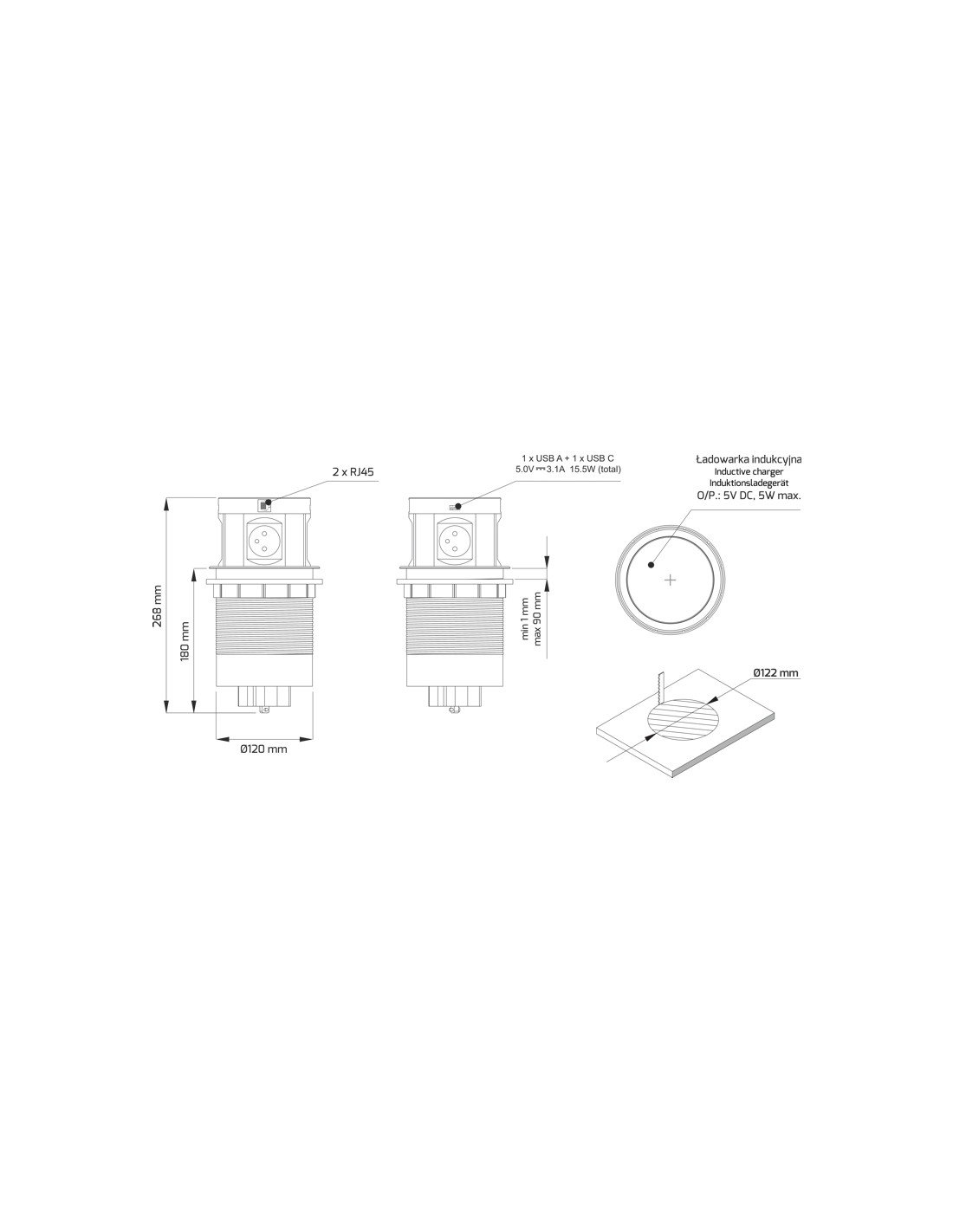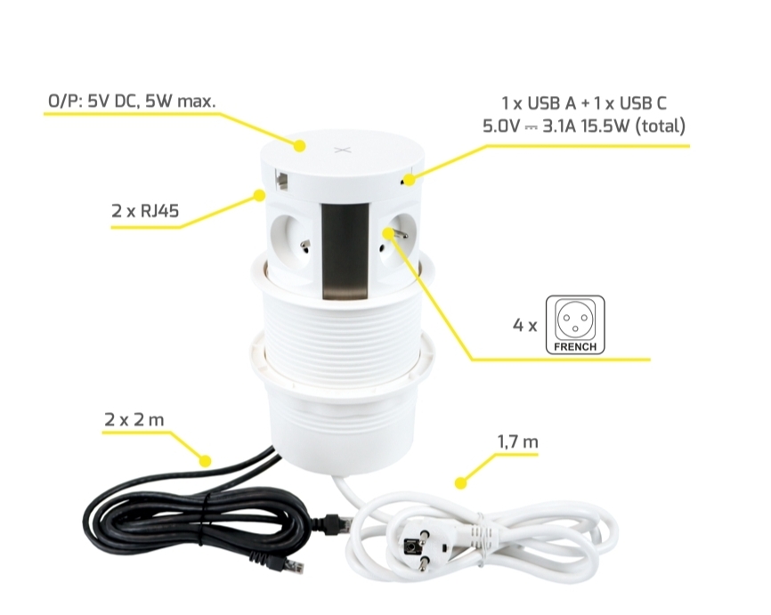 - 4 x zásuvku 230V a 1 x USB A,1 x USB C nabíjecím portem 5V / 3,1 A a 2 x zásuvku RJ 45 pro internet