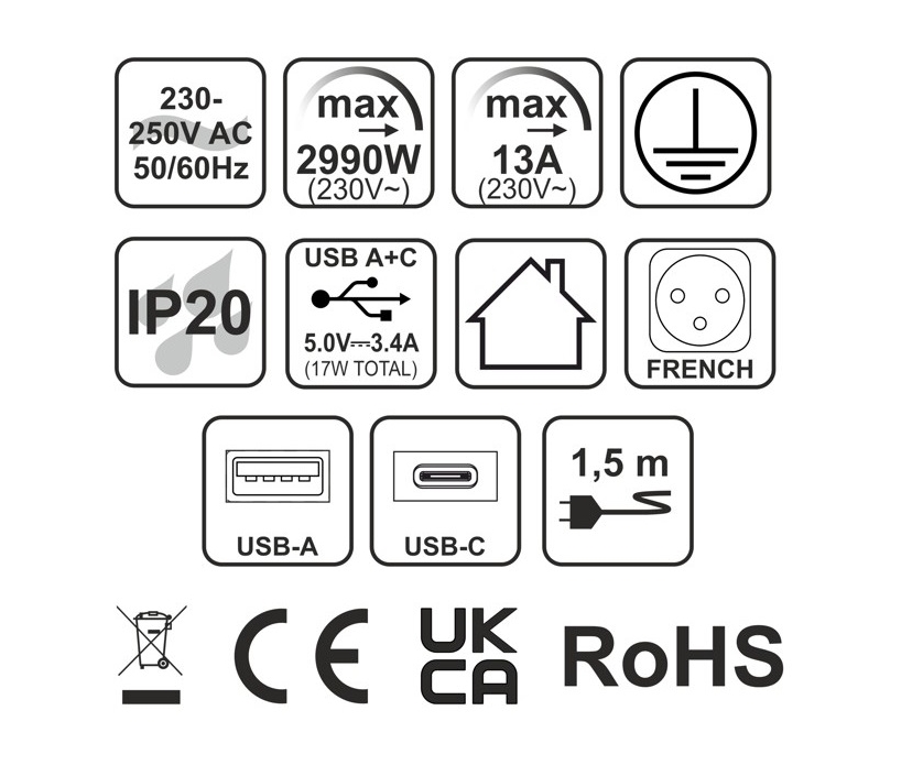 USB-C, 2x230V, USB-A