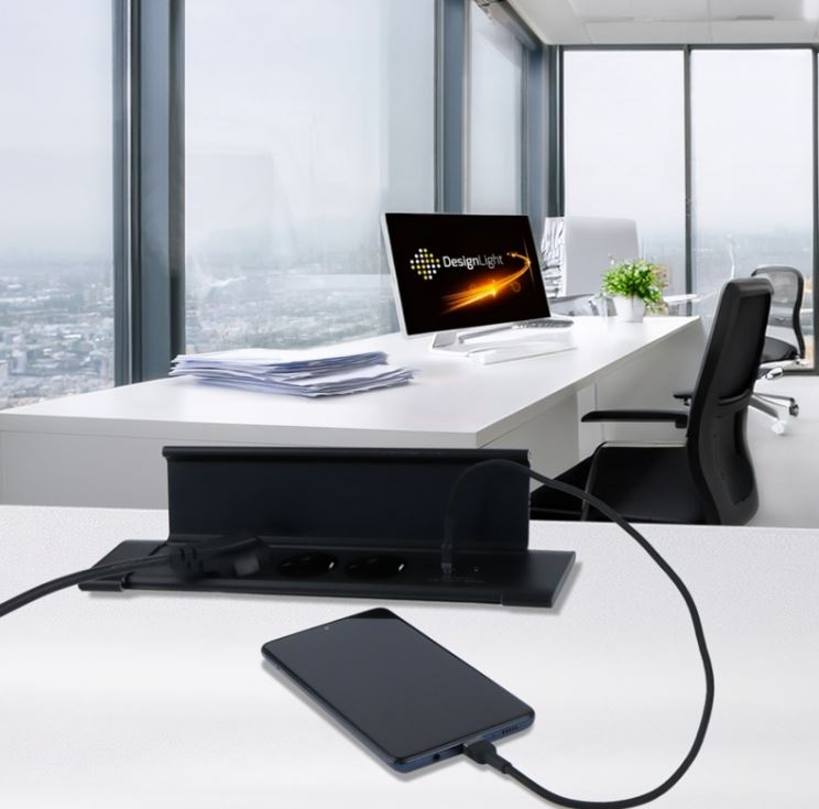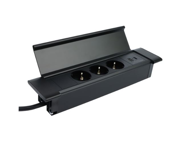 Design Light otevírací zásuvka FLATBOX 3x 230V a 2x USB A/C nabíječka černá