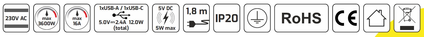 - zásuvka obsahuje: 1 x zásuvku 230V a 2 x USB nabíjecím portem 5V / 2,4 A a 1 x zásuvku RJ 45 pro internet