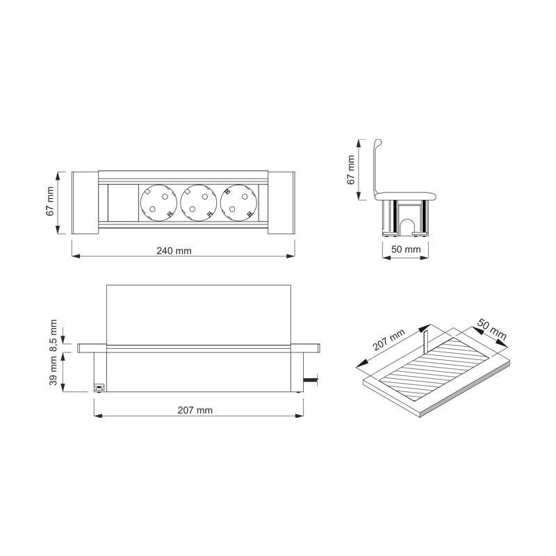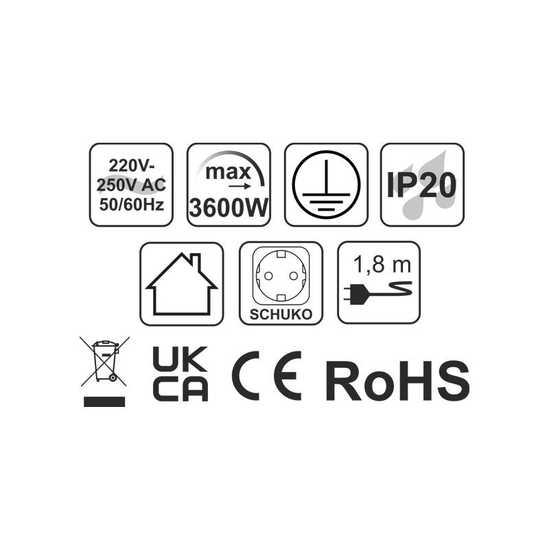 Zásuvka je vyrobena z hliníku a plastu a je vybavena napájecím kabelem o délce 1,8 m zakončeným euro zástrčkou.