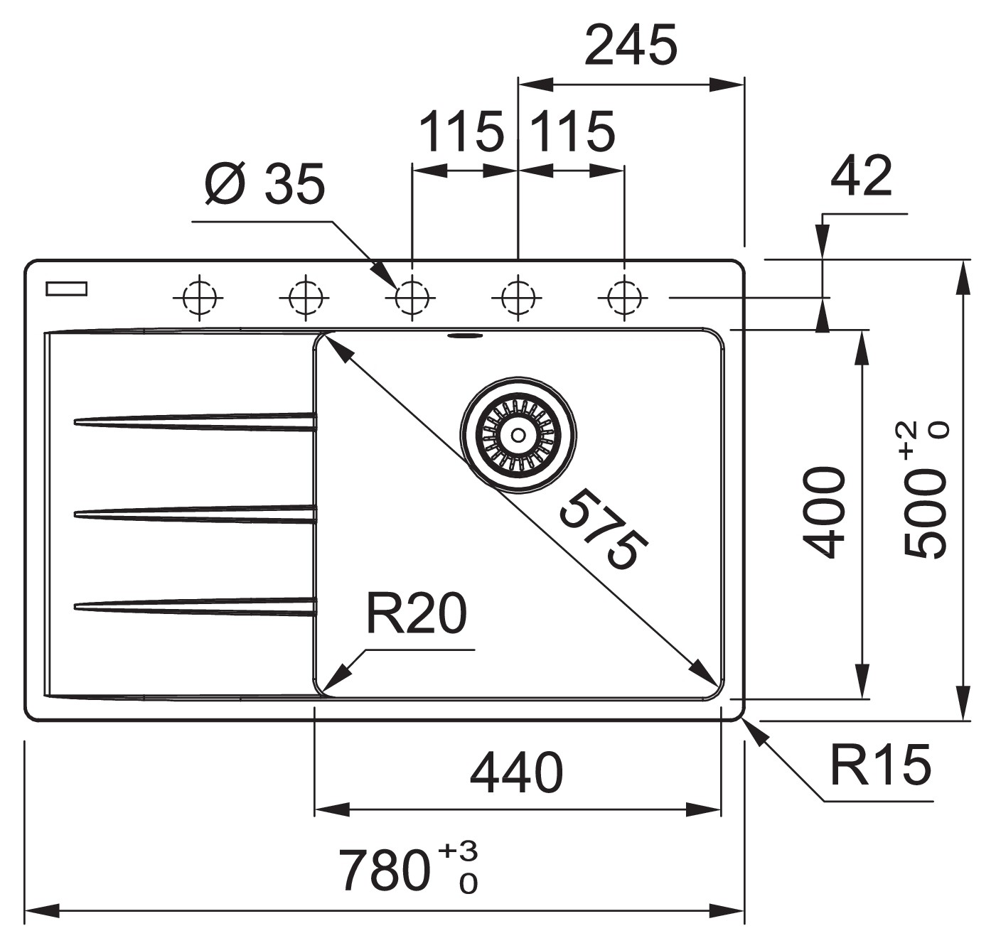 DŘEZ JE Z VÝROBY BEZ OTVORŮ, NUTNO ZHOTOVIT OTVOR PRO BATERII - 4 místa pro vyvrtání otvoru