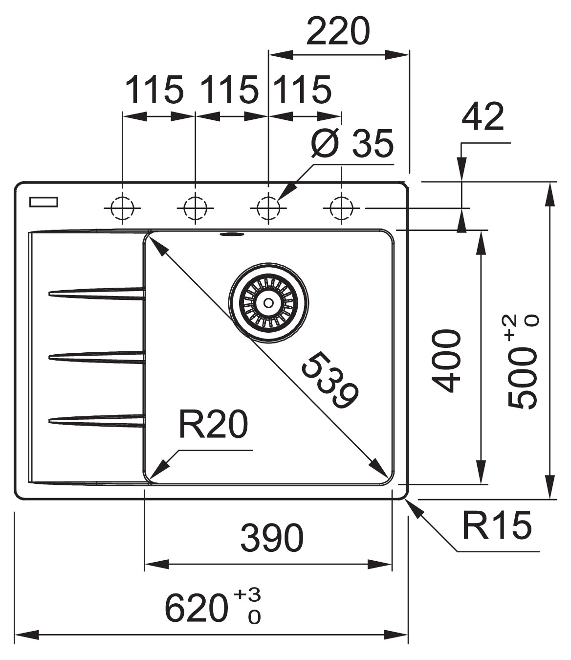 Rozměry dřezu: 620 x 500 mm