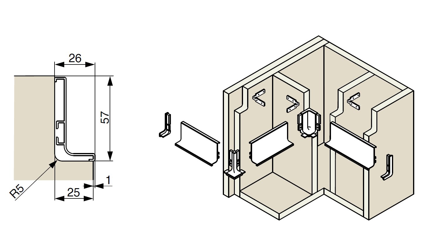 Montáž profilu Gola J pod pracovní desku je pomocí kovového uchycení.
