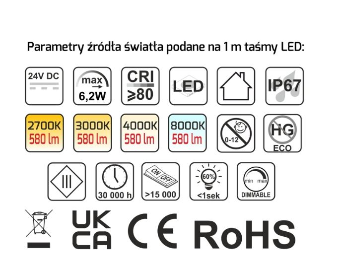 Při spotřebě 6,2W/m dosahuje světelného toku 580 lm/m. Možnost zkracovat po 35,7 mm.