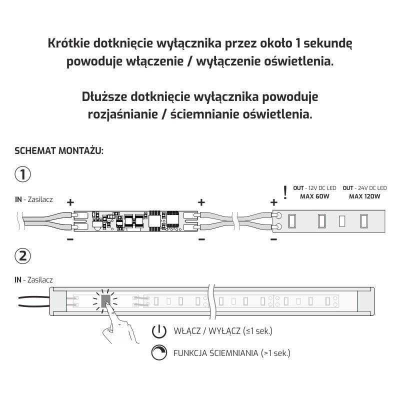 - použití jako vypínač a stmívač dotykový pro LED pásky umístěné v hlinkovém profilu