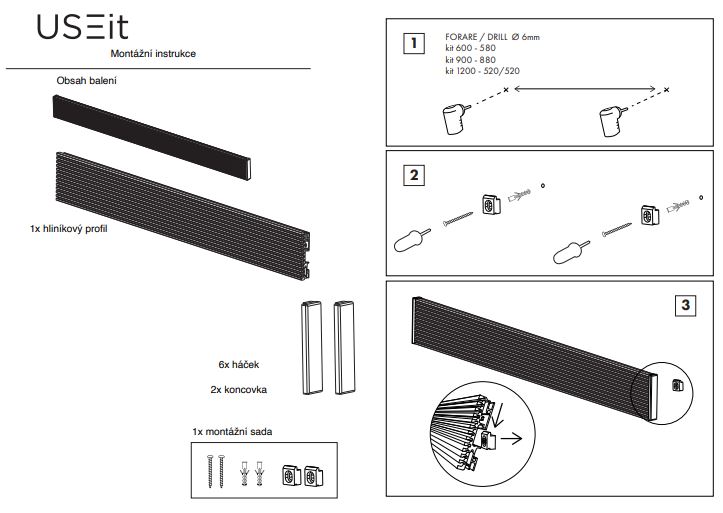 Profil je potřeba doplnit příslušenstvím - háčky, poličky, držák tabletu, držák papírové role.