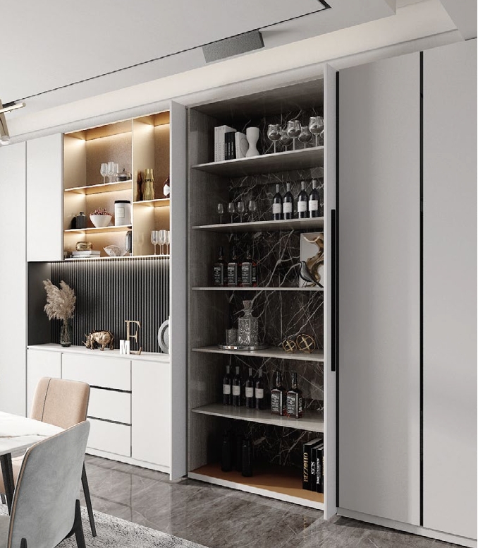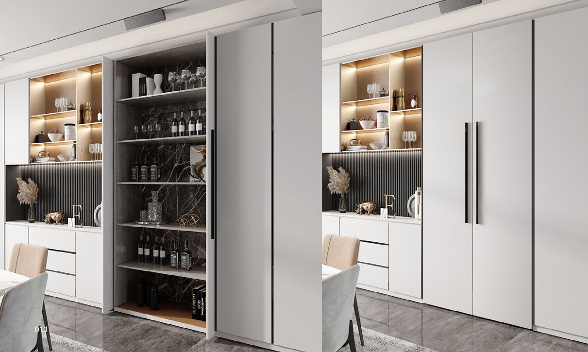 Skříňové zásuvné kování Rotary Ecoline je ideální pro výrobu praktických, prostorově úsporných a moderních designů skříní. Kování umožní skrýt dveře na bok skříně a zajistí tak neomezený přístup do vnitřního prostoru skříně.