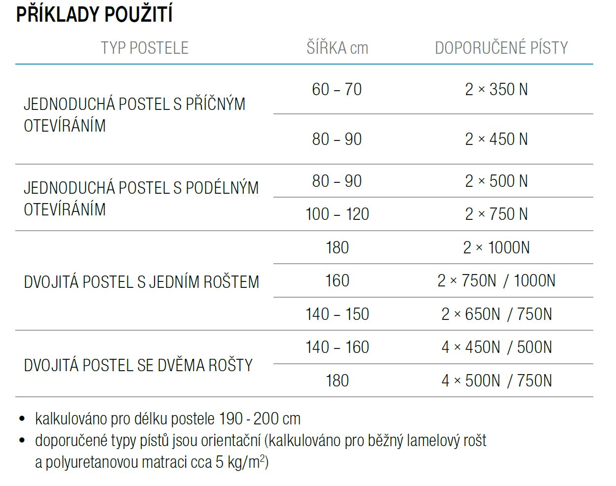 - kalkulováno pro běžný lamelový rošt a matraci cca 5 kg/ m2