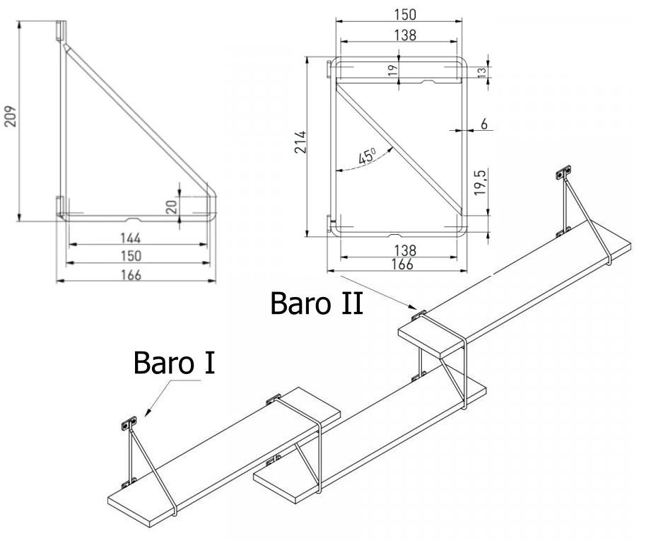 Využití: designová podpěra police s jednoduchou montáží