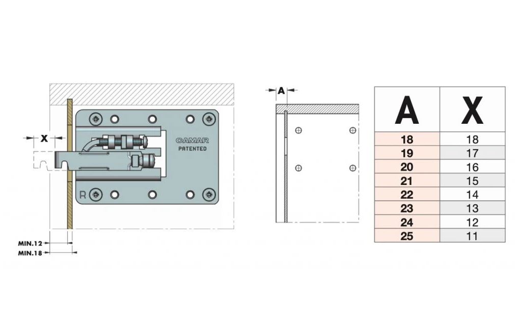 Rektifikační závěs CAMAR 807 XL pravý - technické řešení pro standardní korpus.