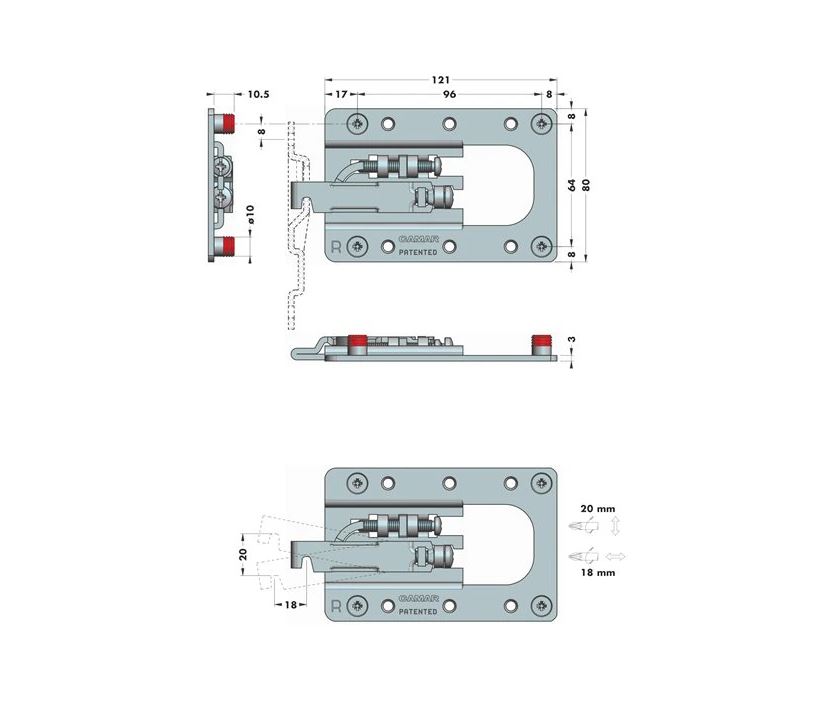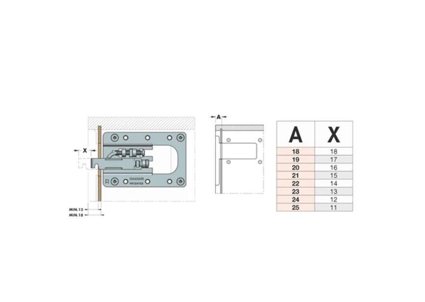 Rektifikační závěs CAMAR 807 XL RV Levý - technické řešení pro korpus se zásuvkou.
