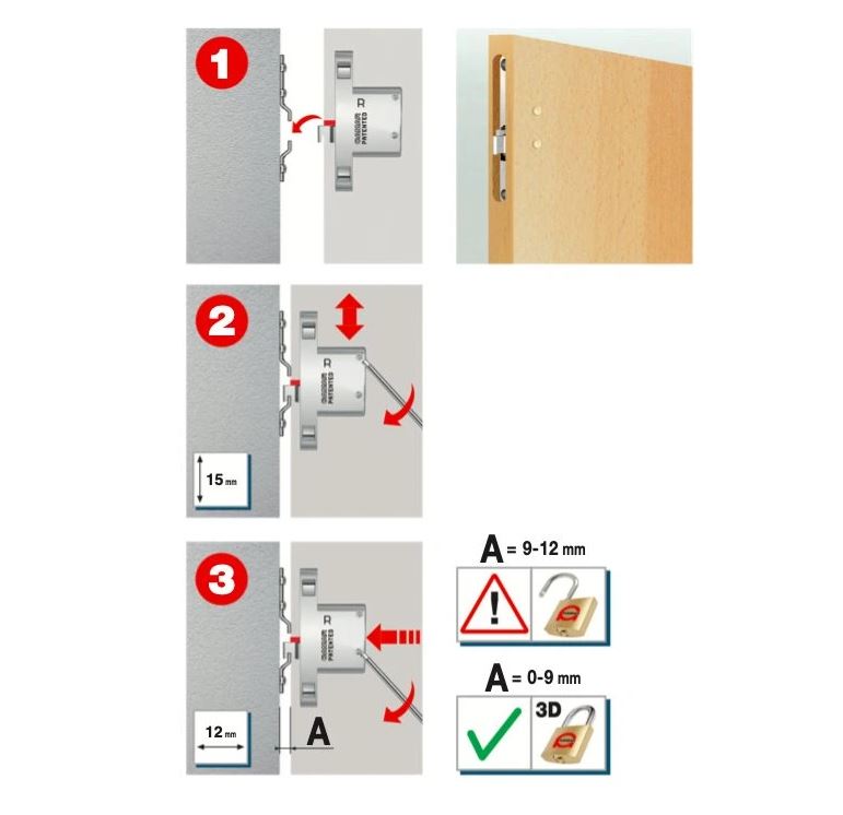 Rektifikační závěs umístěný v hraně korpusu. Je nutné použít závěsný plech pro tento závěs.