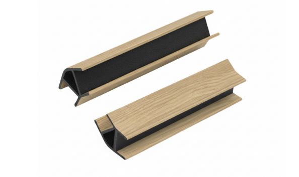 Oboustranný roh 135° k plastovému soklu v dekoru dýha dub.