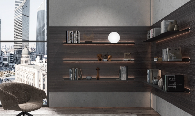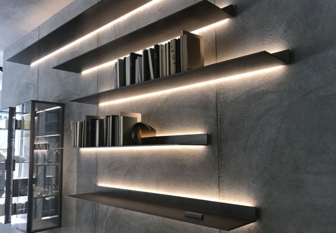 Hliníkový policový systém Shelf s možností podsvícení jako doplněk moderního interiéru.