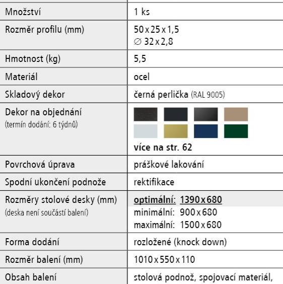Podnož je vybavena praktickým sklopným mechanismem, který umožňuje jednoduchou manipulaci a úsporné skladování stolů. Díky kolečkům lze stoly snadno přesouvat podle aktuální potřeby.Je navržena pro stolové desky o optimálním rozměru 1390 x 680 mm.