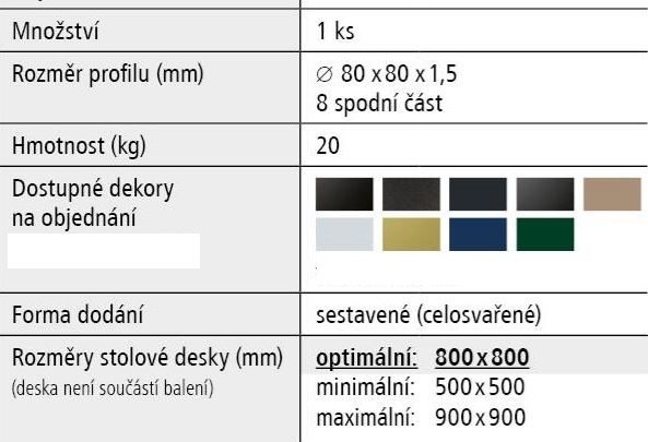 - Optimální rozměry stolové desky: 800 x 800 x 36 mm