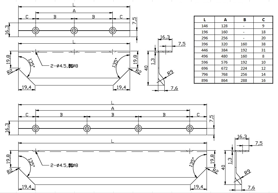 146 mm, 196 mm, 296 mm, 396 mm, 446 mm, 496 mm, 596 mm, 696 mm, 796 mm, 896 mm