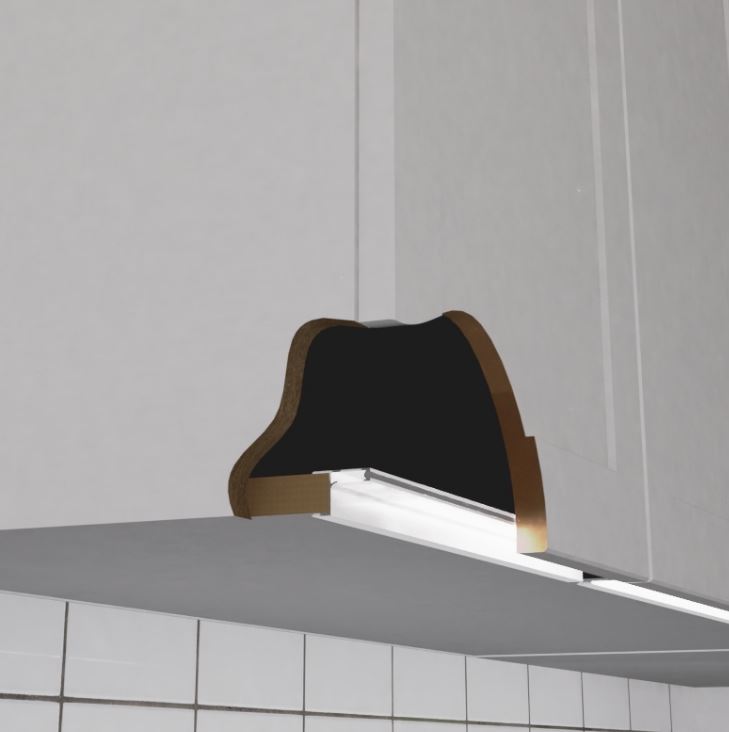Umožňuje otevírání čel bez úchytky a současně zajišťuje osvětlení prostoru mezi skříňkami a pracovní deskou.