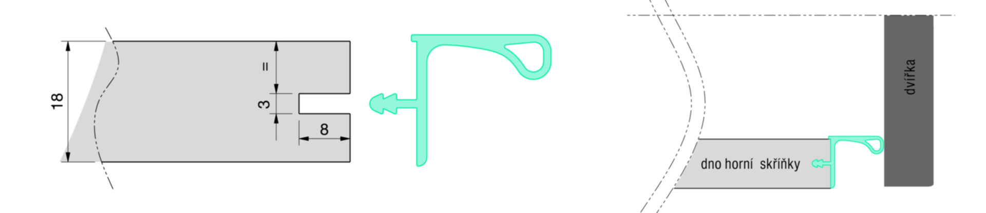 - Bezúchytkové profily pro horní skříňky
