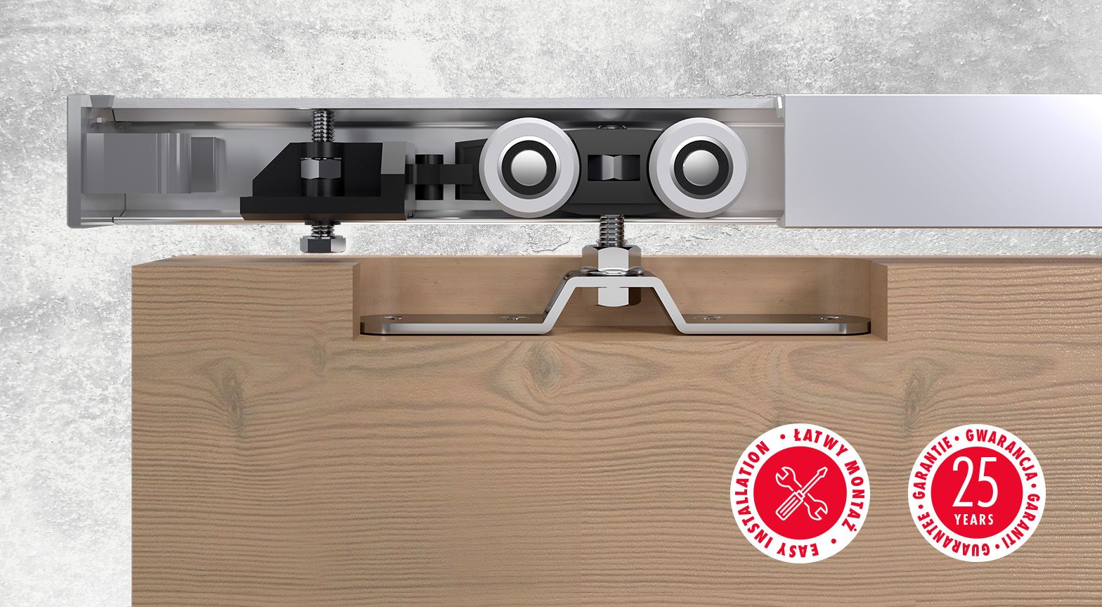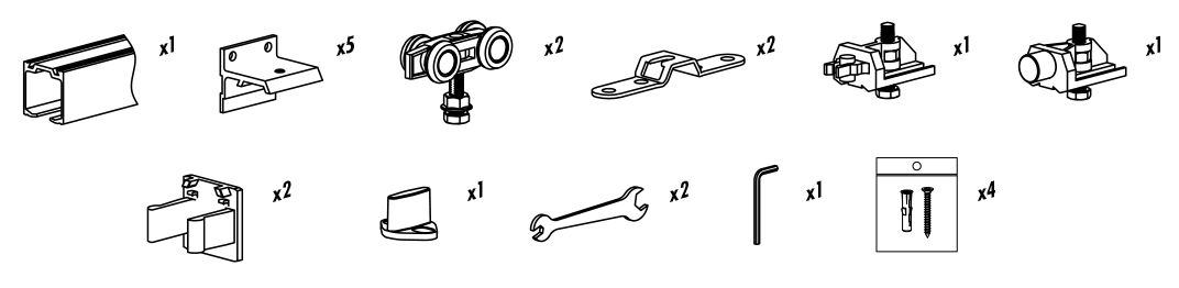Samostatně lze dokoupit tlumiče Silent Stop, držáky kolejnice pro sílu dveří do 25 mm, spojku, popř. sadu symetric.