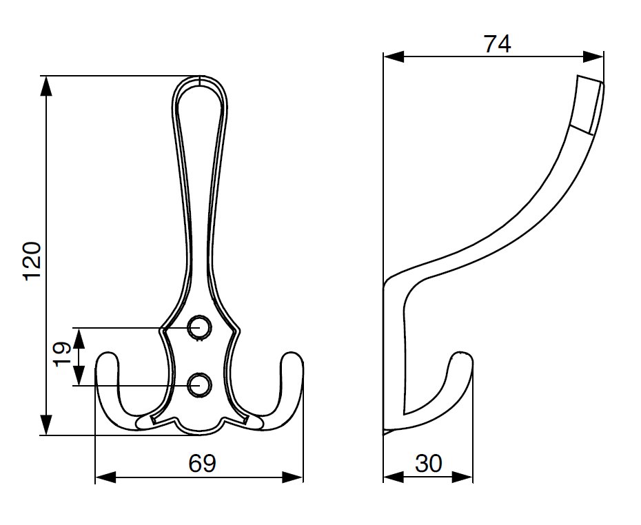Z přední strany věšáku jsou 2 otvory, kterými přišroubujeme věšák šroubky k vhodnému podkladu (nábytek, dřevo, stěna).