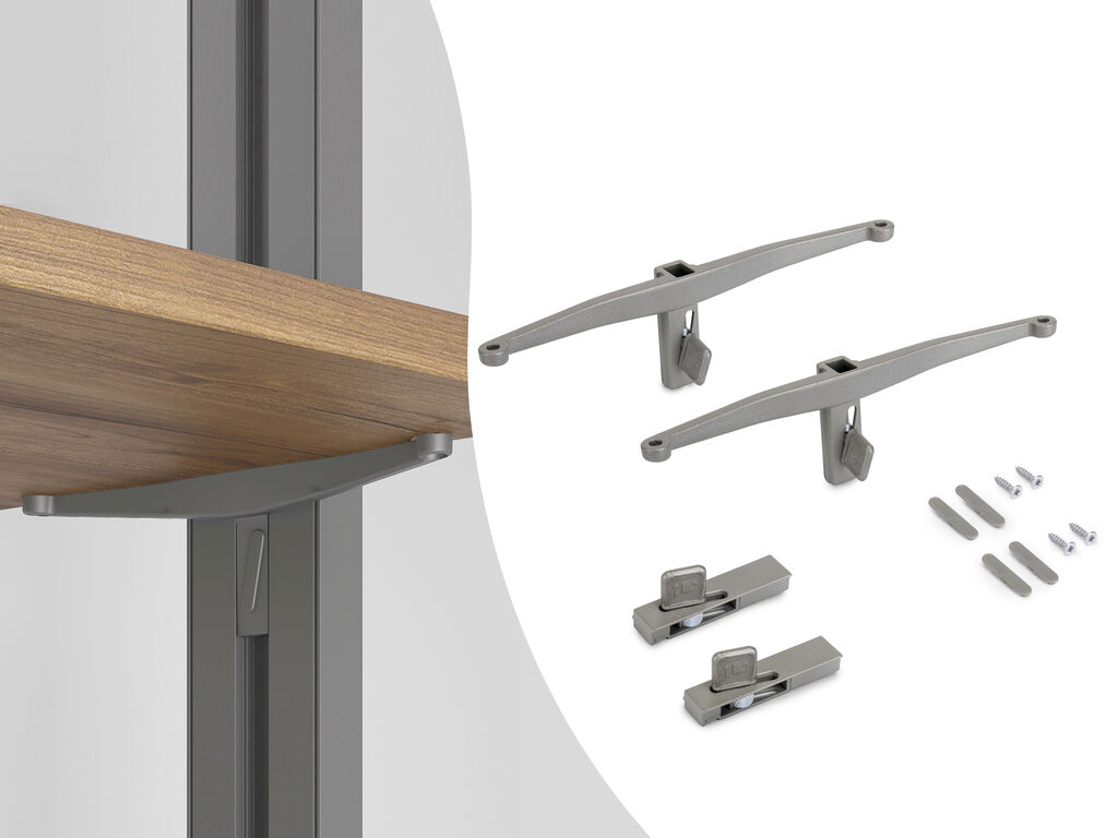Kompletní sada držáků pro uchycení dřevěné police včetně krytek pro konstrukční profil ZERO.
